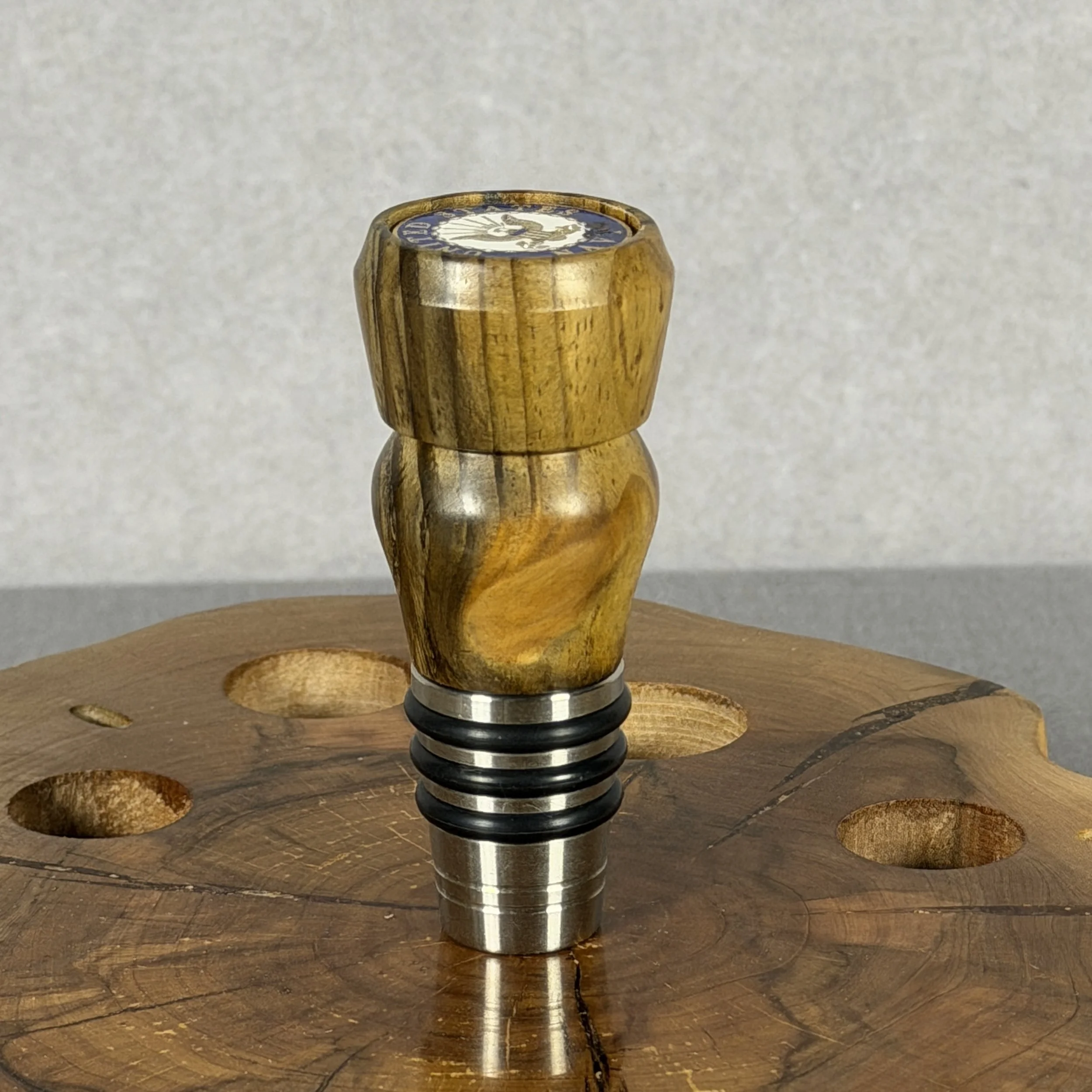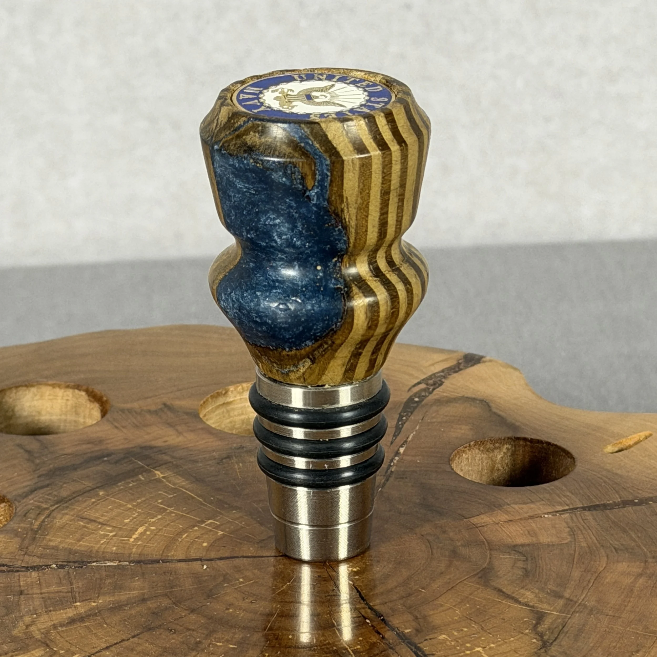 A hand-turned whiskey topper featuring an inlaid U.S. Navy emblem, crafted from Battleship Texas deck wood. A collectible nod to naval pride and tradition.
