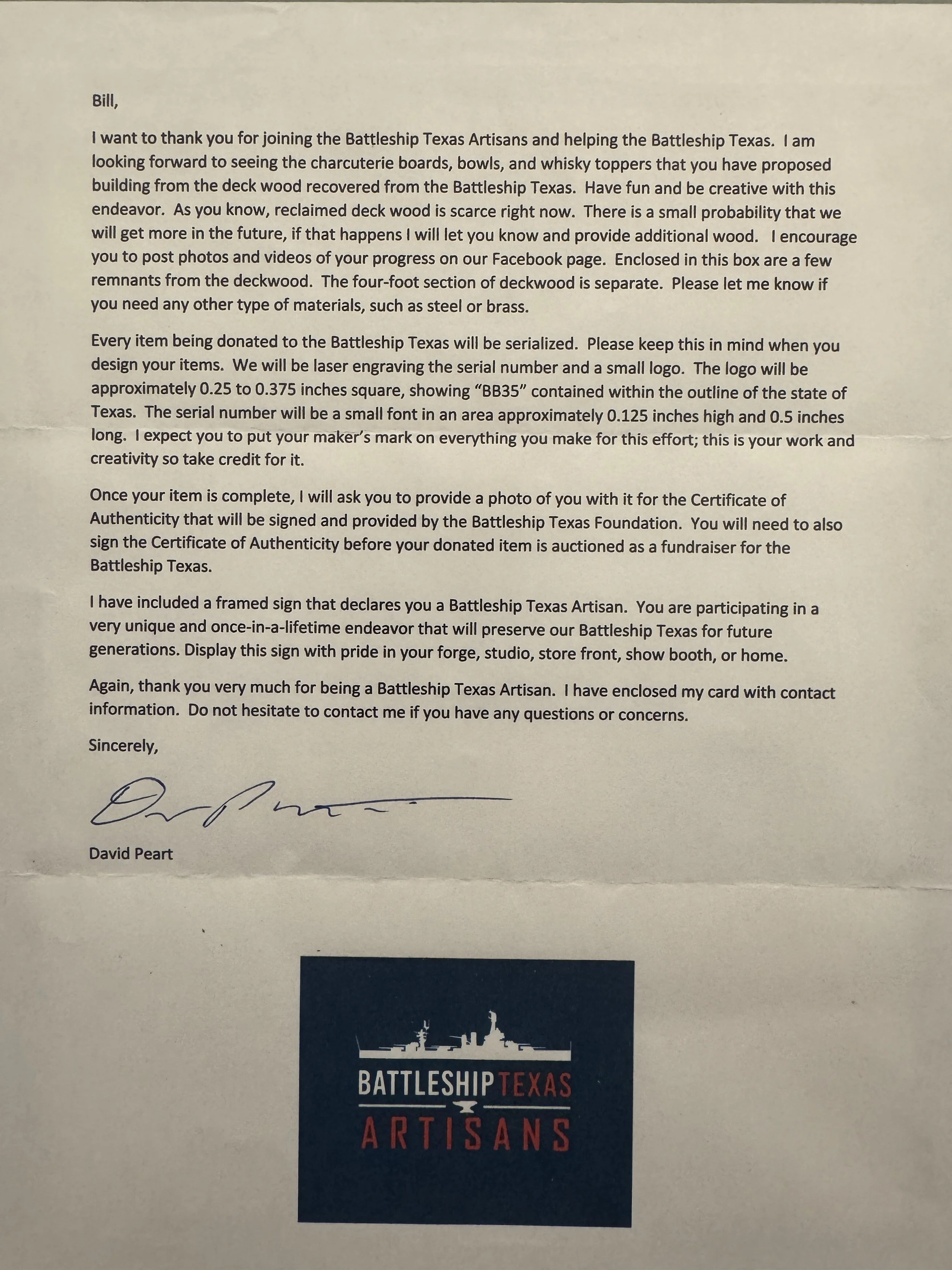 In 2022, I was honored to be invited by the Battleship Texas Foundation to take part in a historic project. Out of 168 artisans across Texas, just 12 of us were woodworkers. Blade smiths were given steel, and we were entrusted with planks from the ship’s century-old deck.