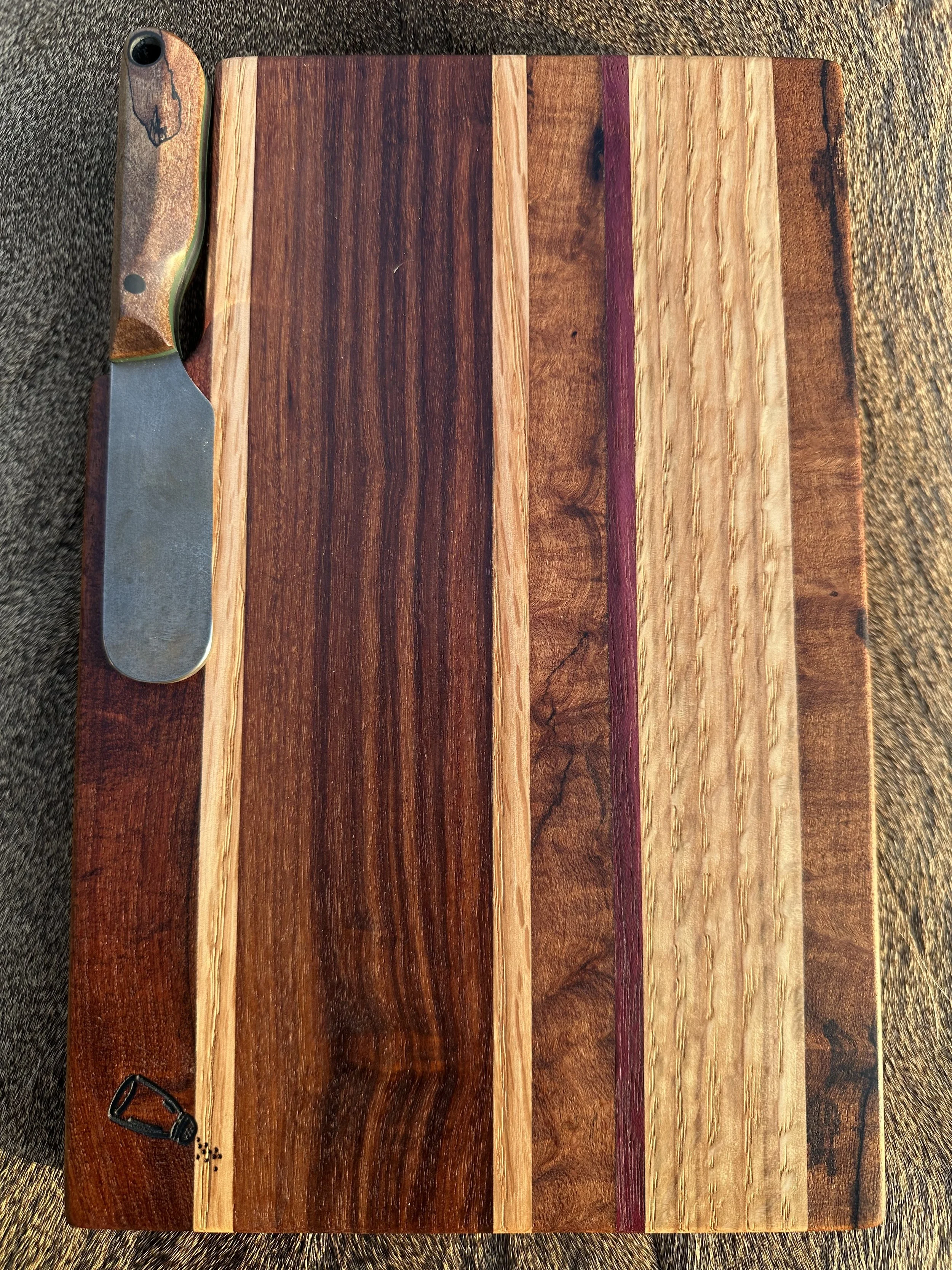 To pair with the Knoon, I crafted small charcuterie boards from reclaimed Texas wood. Each board is shaped with a custom cutout, and just below it, embedded magnets hold the Knoon securely in place. The result is a set that blends forged steel and reclaimed wood into something truly unique.