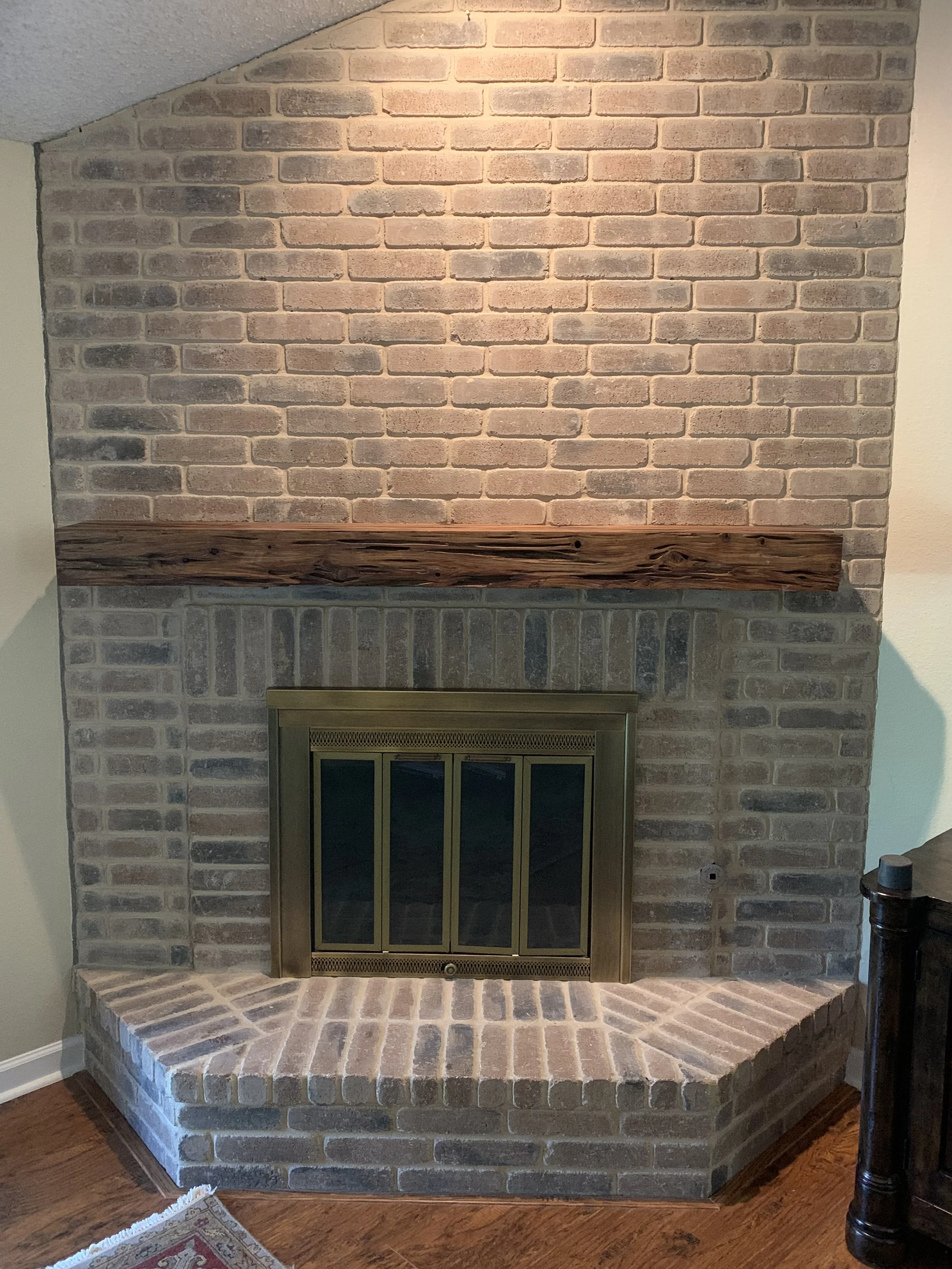 Custom mantle crafted from Guadalupe “Pecky” Sinker Cypress — the first piece made from this reclaimed river wood.